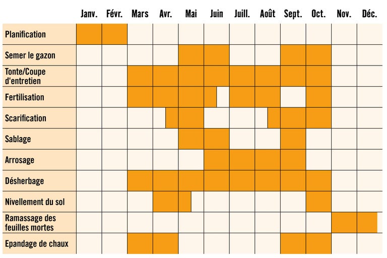 Ce calendrier t'aide à garder à l'esprit les dates clés de l'entretien de ton gazon. Tu sauras ainsi quand tu dois fertiliser, tondre ou scarifier ton sol.