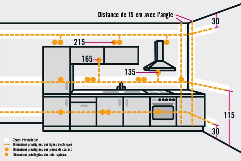 30 cm au-dessus du revêtement de sol. - Prises de courant au-dessus des plans de travail pour les appareils de cuisine (au moins 5 sont recommandées):