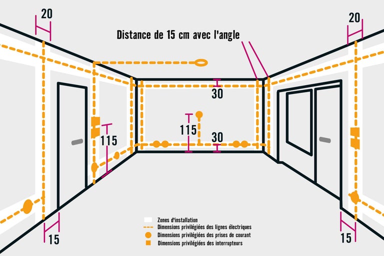 Lors de la planification de tes lignes électriques, veille à respecter une distance d'environ 30 cm par rapport au plafond ou au sol et de 15 cm par rapport aux coins et aux cadres de fenêtres. Tu seras ainsi à l'abri des plinthes et si tu souhaites suspendre le plafond, les câbles ne seront pas en danger.