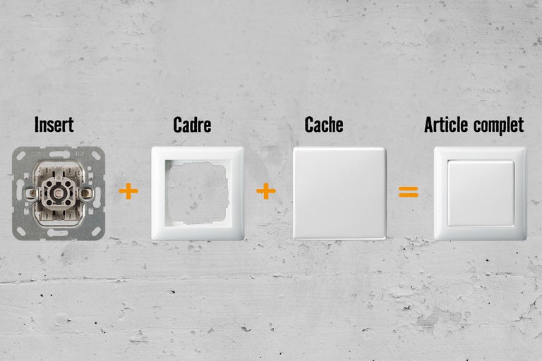 L'insert, généralement peu esthétique, se cache dans le mur et est responsable de la fonction technique. Le cadre relie le cache à l'insert et est disponible en une à cinq versions.