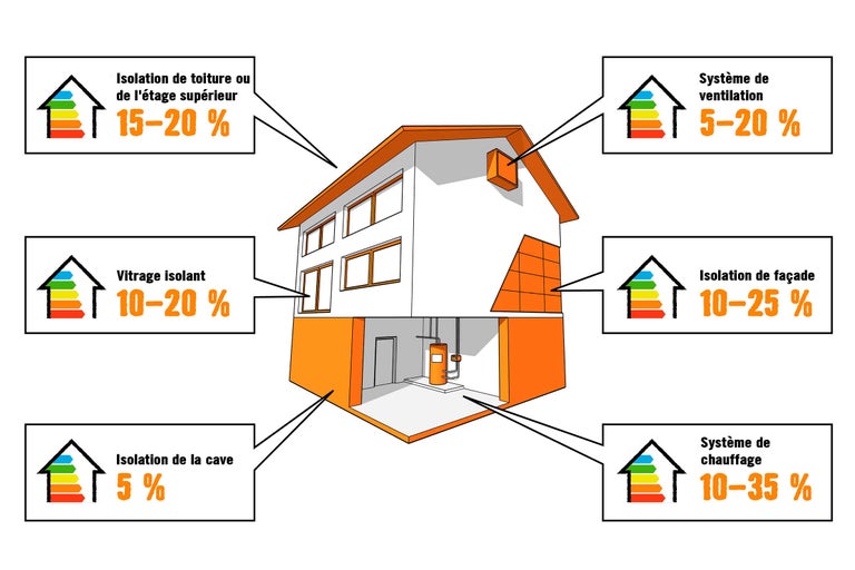 Selon une étude de la société de conseil à but non lucratif co2online, l'isolation de la façade permet de réaliser les économies les plus importantes, suivie de près par l'isolation du toit et le remplacement du système de chauffage.