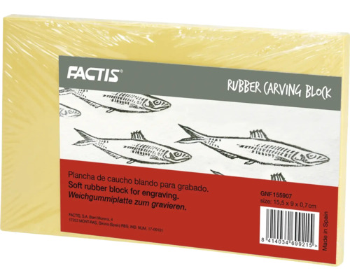 Die biegsame Softdruckplatte “Factis rubber carving block” ist ideal für schöne Hochdruckprojekte geeignet. Die weiche Oberfläche garantiert das leichte Arbeiten mit dem Schnitzwerkzeug. Saubere Schnitte und eine präzise Linienführung – auch von Rundungen – sind so kein Problem. Einfach mit Wasser zu reinigen, wieder verwendbar. Ideal in Kombination mit der Textildruckfarbe Textil Print.