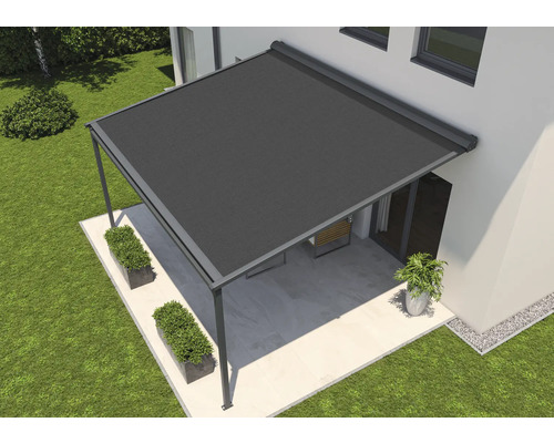 SOLUNA Pergola mit Stoffdach 5x4 Stoff Dessin 8446 Gestell RAL 7016 anthrazitgrau Antrieb rechts inkl. Motor, Wandschalter (Wandbefestigung)