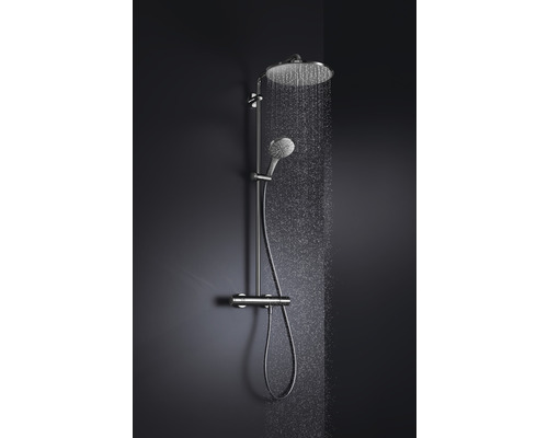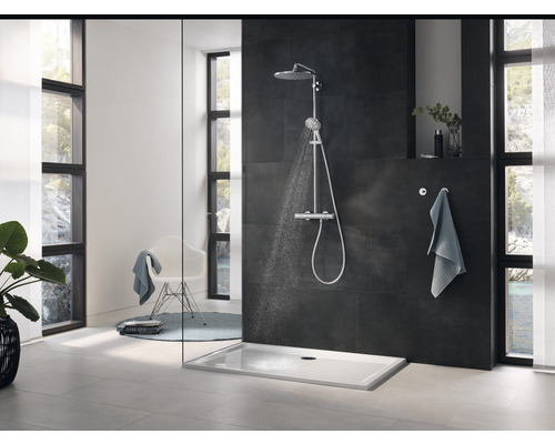 - ParticularitésGROHE DreamSpray® (répartition homogène de l'eau sur toutes les buses actives) ● SpeedClean (élimination des dépôts de calcaire sur les buses en silicone par simple essuyage) ● GROHE StarLight® (surface chromée à longue durée de vie, facile à nettoyer) ● GROHE EcoJoy® (économiser de l'eau tout en profitant des bienfaits de la douche) ● Joint à rotule avec angle de rotation ± 10°