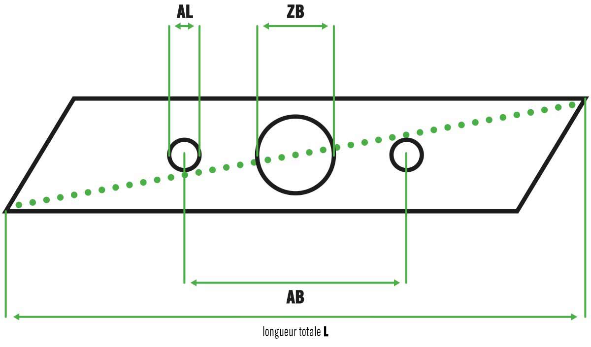 - la distance entre les trous extérieurs, mesurée du centre du trou au centre du trou, en mm (AB)