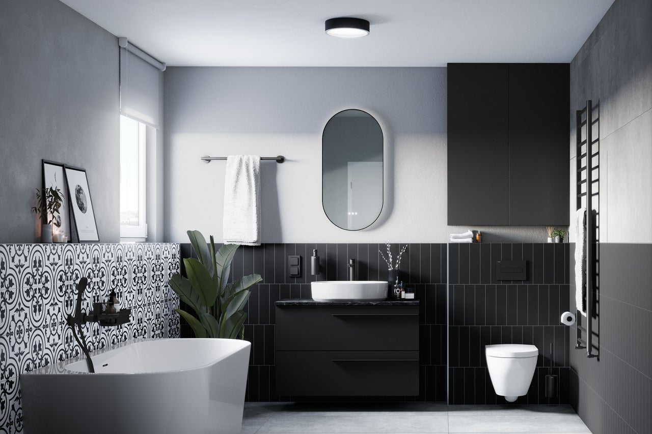 Ein Bad, das Geschichten erzählt: Mit dekorativen Fliesen im stilvollen Retrolook und edlem Feinsteinzeug der Serie MIRAVA Manhattan anthracite entsteht ein Raum voller Charakter und zeitloser Schönheit. Die exklusive Keramik- und Armaturenserie Lida von Laufen, kombiniert mit passenden Badmöbeln und Accessoires aus derselben Linie, setzt klare Akzente für Designliebhaber. Abgerundet wird das Konzept durch die halb freistehend eingebaute Badewanne der Marke Jungborn – ein Statement für luxuriöse Entspannung.