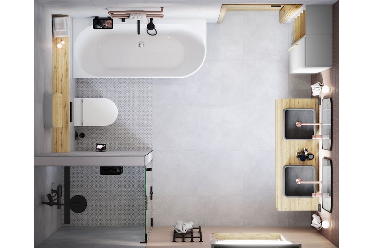 Ein Bad, das moderne Eleganz neu definiert: Schlichte graue Uni-Fliesen, kombiniert mit stilvollen Ornamenten, schaffen eine harmonische Basis. Der markante Aufsatz-Waschtisch in Betonoptik mit einer Unterputz-Armatur in edlem Kupfer matt setzt ein klares Design-Statement. Praktische Magnet-Accessoires in modernem Schwarz und attraktive Badmöbel in der Kombination Grau und Eiche verleihen dem Raum Funktionalität und Wärme. Abgerundet wird das Konzept durch eine platzsparende Eckbadewanne und ein klassisches WC-Set in Weiß.