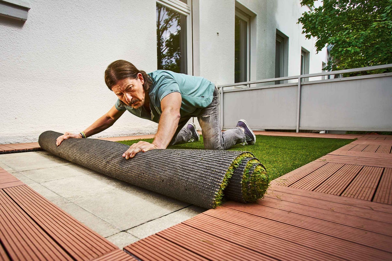 Willst Du es Dir bei Aufwand und Pflege möglichst einfach machen, greifst Du am besten zu Klickfliesen oder rollst einen Kunstrasen aus. Beide sind denkbar leicht zu verlegen und im Preis erschwinglich. Klickfliesen gibt es aus WPC, Holz, Naturstein und Kunstrasen. Für die Verlegung solltest Du Dir ungefähr ein Wochenende einplanen.