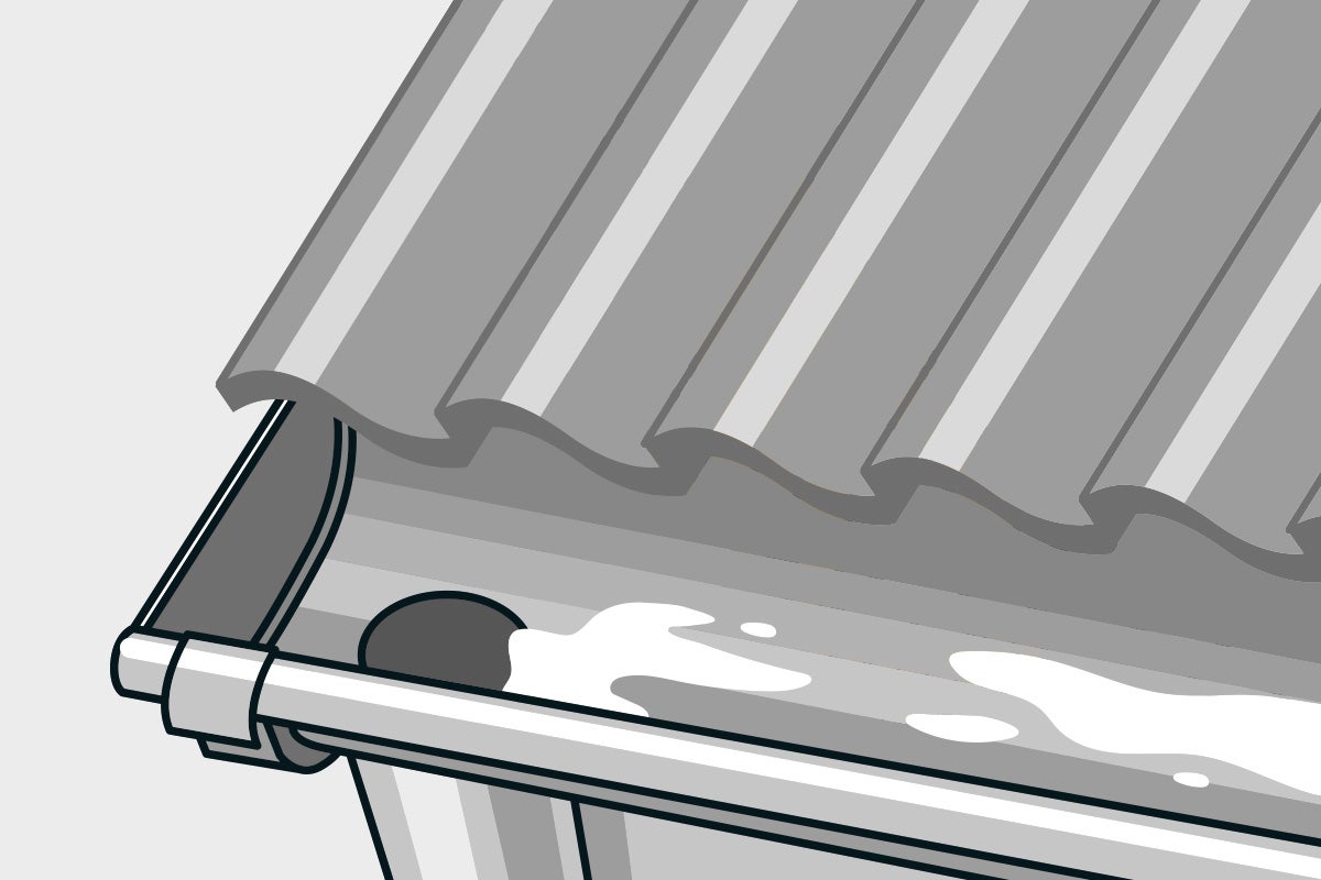 Verstopfte Dachrinne, Feuchtigkeit, Schimmel. Wenn Du Deine Dachrinne nicht regelmäßig reinigst, wird sie durch Blätter und anderen Schmutz verstopft. Dadurch kann das Wasser nicht abfließen und die feuchten Abfälle fangen an zu schimmeln. Im schlimmsten Fall können so schwere dauerhafte Schäden an Deinem Haus enstehen. Also: Besser die Dachrinne reinigen.