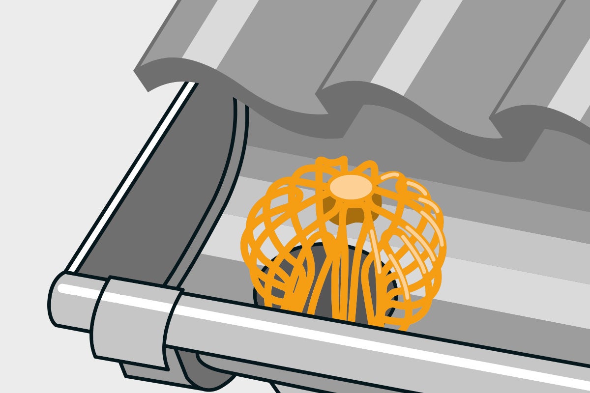 Mit einem Rinnensieb am Fallrohr verhinderst Du, dass es verstopft. Um ein passendes Rinnensieb zu wählen, musst Du den Durchmesser Deines Fallrohrs ausmessen. Drücke das Rinnensieb vorsichtig zusammen und setze es direkt in die Öffnung, an der die Dachrinne in das Fallrohr übergeht.