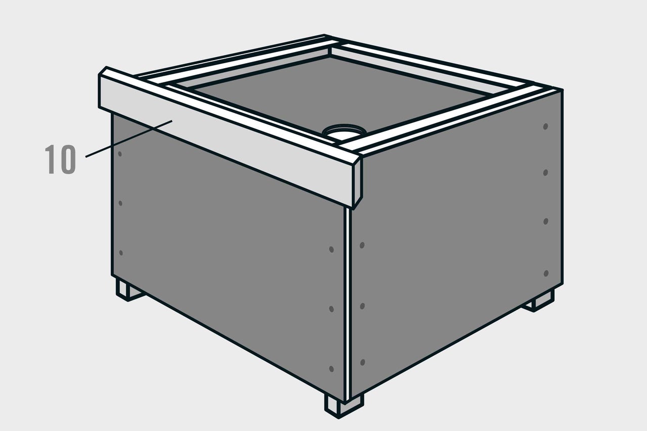 Lass den Kleber aushärten. In der Zwischenzeit können die Rhombusleisten für die Verkleidung der Seitenwände zugesägt werden (ohne Abb.). Die Leisten (7) für die beiden Seitenwände sind gleich lang. Die Leisten (8) und (9) für die Vorderseite sowie die Leisten (10) für die Rückseite überdecken die Leisten der Seitenwände.