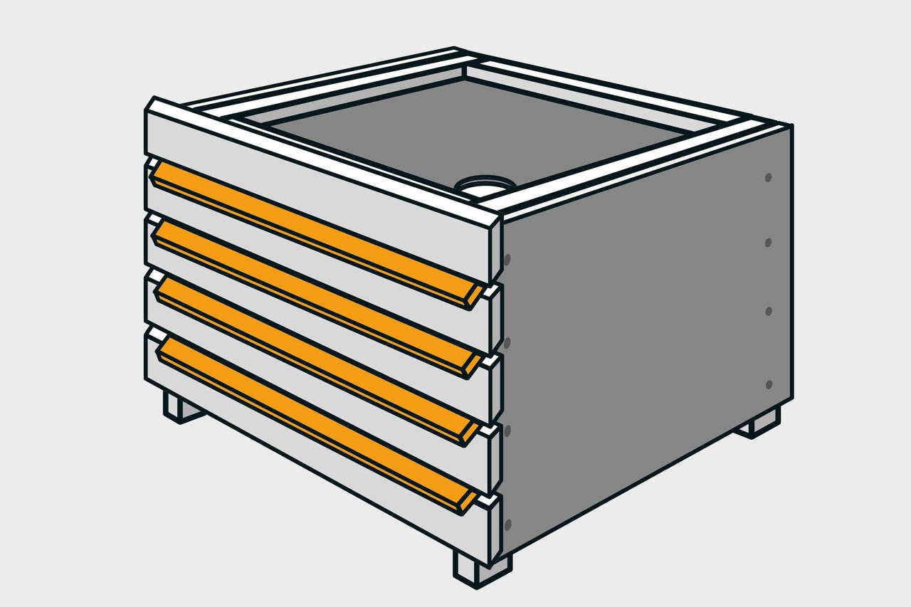 Die Mähroboter-Garage bekommt ein stabiles Gehäuse aus Kanthölzern und Siebdruckplatten. Darauf werden Rhombusleisten als Verkleidung montiert. Das Garagendach wird mit Teichfolie ausgekleidet und so zur Pflanzschale. Mit einem Abfluss verhinderst Du Staunässe an den Pflanzenwurzeln.