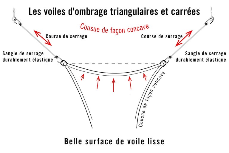 Les voiles d'ombrage triangulaires et carrées peuvent être montées rapidement et facilement. Les sangles durablement élastiques assurent une sécurité maximale. La tension permanente exercée dans les angles de la voile permet de tirer les forces tangentielles de l'intérieur vers l'extérieur et donc de lisser la voile. Le milieu de la voile est allégé, ce qui évite la formation de plis et de poches d'eau.