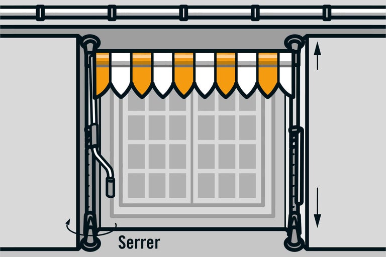 Pour ce type de store, la toile est tendue par au moins deux bras articulés. Pour protéger le tissu à l'état enroulé, il est préférable de l'installer sous l'avant-toit ou d'installer un toit protecteur séparé.