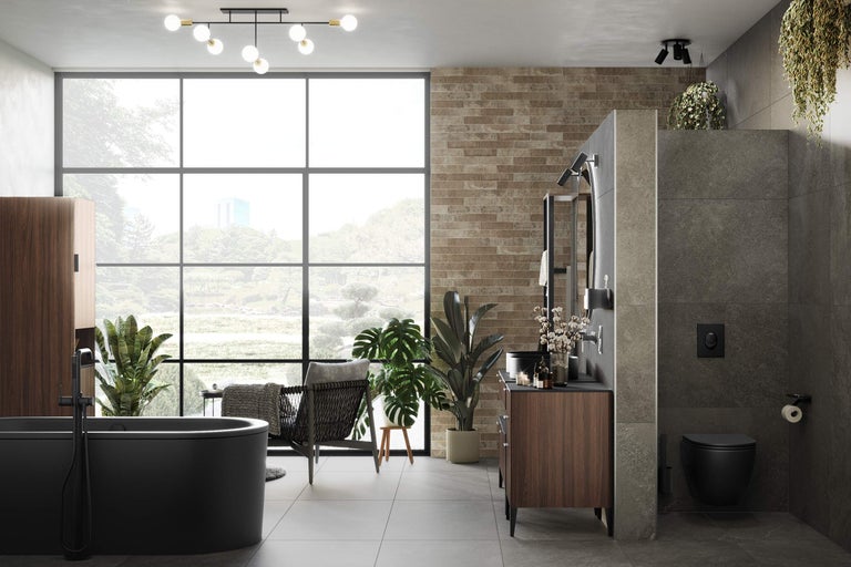 Une salle de bains qui allie architecture moderne et détails marquants: la combinaison captivante de grands carreaux en grès cérame fin et de petits carreaux de brique crée un effet dynamique dans la pièce. Les meubles de salle de bains confortables avec des façades en Expressive Oak et noir apportent chaleur et élégance. La céramique dans la couleur tendance noir mat de Jungborn et Form&Style, complétée par des robinets et des séries d'équipements assortis en noir, affiche clairement un design contemporain. La