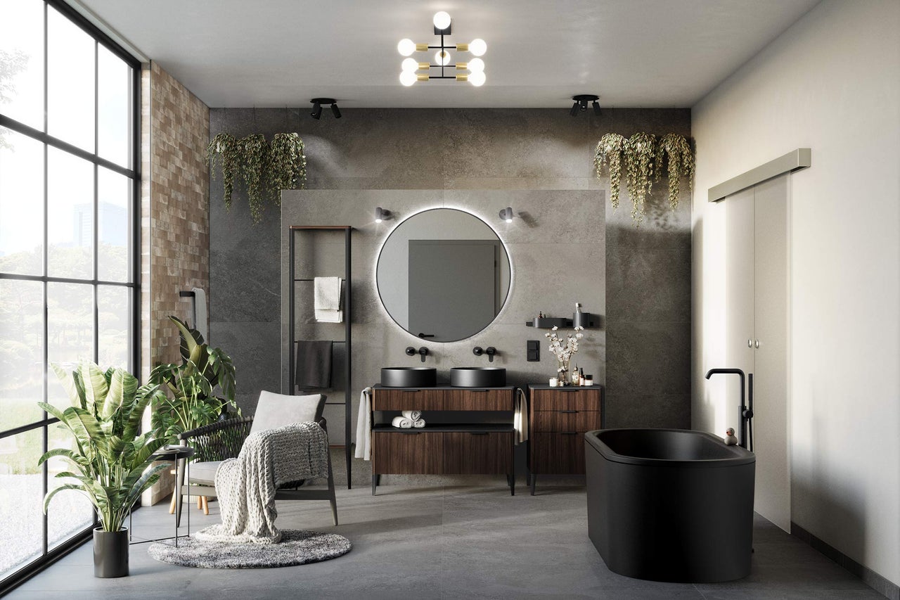 Une salle de bains qui allie architecture moderne et détails marquants: la combinaison captivante de grands carreaux en grès cérame fin et de petits carreaux de brique crée un effet dynamique dans la pièce. Les meubles de salle de bains confortables avec des façades en Expressive Oak et noir apportent chaleur et élégance. La céramique dans la couleur tendance noir mat de Jungborn et Form&Style, complétée par des robinets et des séries d'équipements assortis en noir, affiche clairement un design contemporain. La