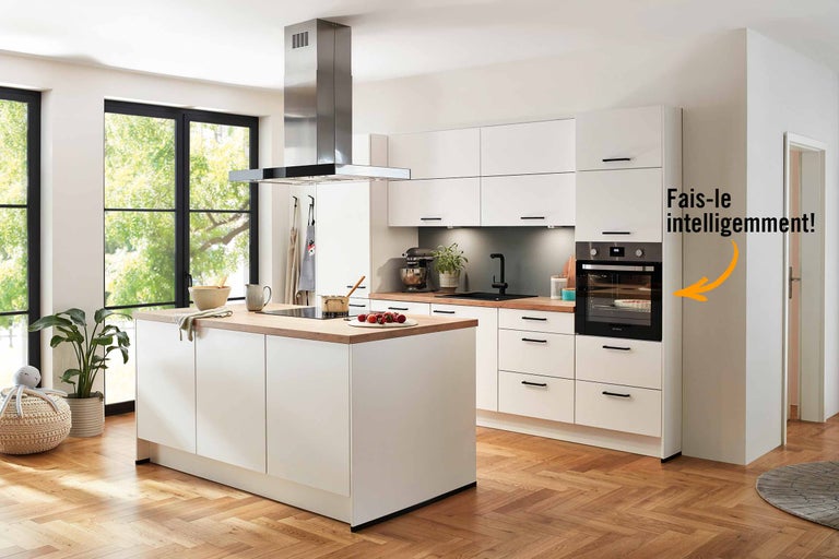Détermine d'abord la position exacte de l'îlot de cuisine dans la pièce. Trace ensuite sur le sol les lignes de contour (a/b) de la dimension totale déterminée – exactement à angle droit l'une par rapport à l'autre. Les angles droits peuvent être facilement dessinés avec une équerre de maçon. Tu peux également mesurer les deux diagonales (x/y) – si elles sont de même longueur, alors les côtés (a/b) sont à angle droit – sinon tu dois à nouveau rectifier.