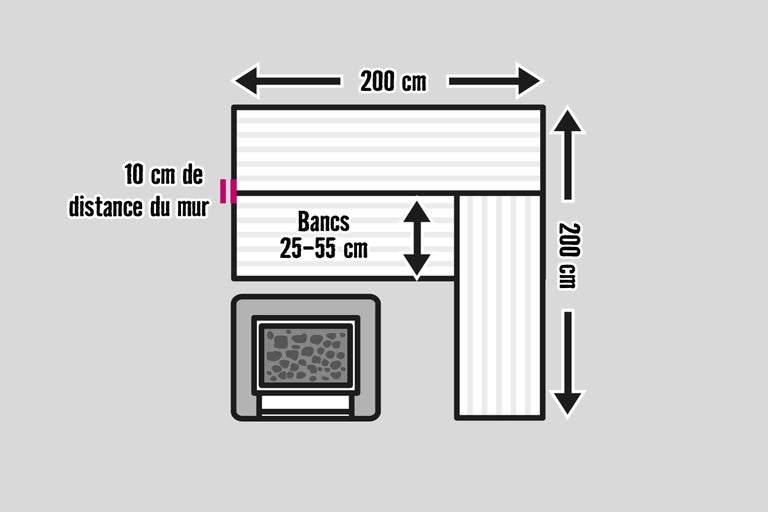 Le sauna ne devrait pas être plus grand que nécessaire, car cela augmente les coûts de chauffage. Pour la surface, il faut prévoir au moins 1 à 1,5 m² par personne. Un sauna à domicile pour 4 personnes ne devrait donc pas être plus petit que 2 x 2 m. Le sauna devrait être placé à 10 cm du mur et également à 10 cm du plafond.