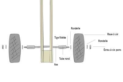 Ensuite, place une rondelle M16 de chaque côté de l'axe. Puis, place les roues pneumatiques sur l'axe de manière à ce qu'elles affleurent le tube rond. Ensuite, place à nouveau une rondelle M16 de chaque côté de l'axe et visse-les avec un écrou M16 (clé de 24 mm).