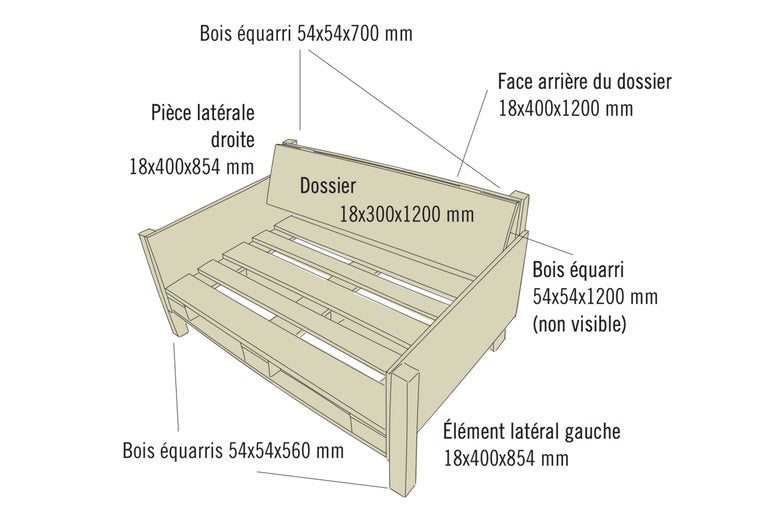 Place le dossier (panneau en bois lamellé-collé 18x300x1200 mm) au dos du dossier (panneau en bois lamellé-collé 18x400x1200 mm), …
