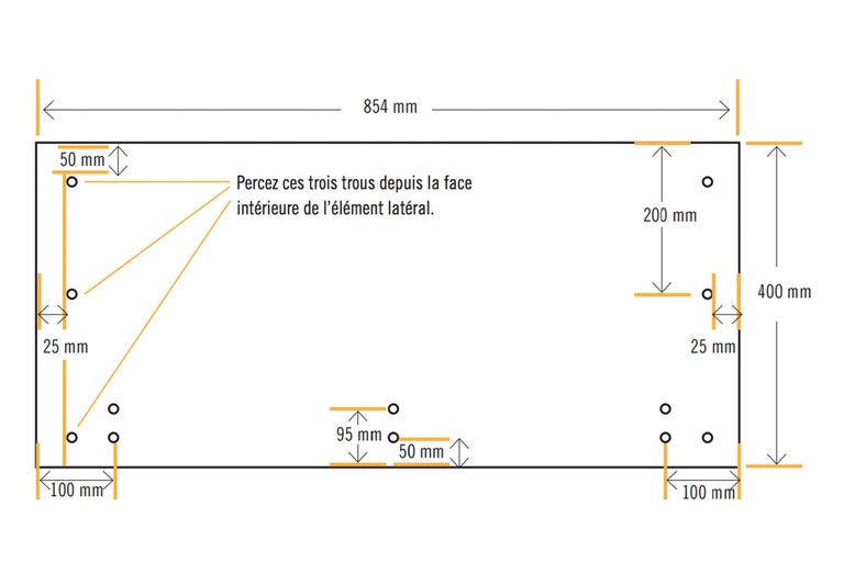 Pré-perce l’élément latéral gauche et l’élément latéral droit (panneaux en bois lamellé-collé 18x400x854 mm) conformément au schéma de perçage.