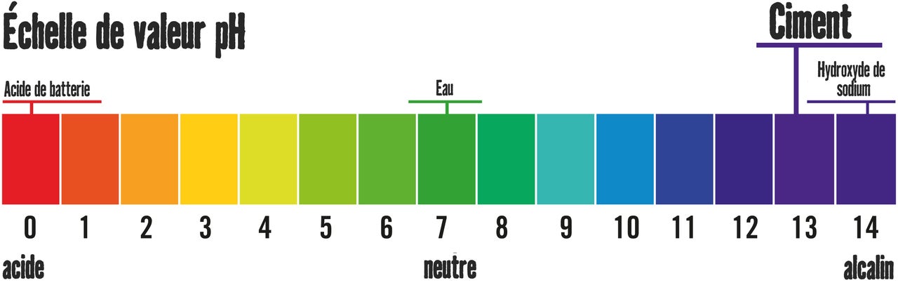 Le ciment provoque des brûlures chimiques. Il s'agit de brûlures douloureuses de la peau. Le liant réagit avec l'eau ajoutée et devient alors extrêmement alcalin. Le pH peut parfois atteindre 13, ce qui correspond à un niveau fortement alcalin. C'est pourquoi il est important de porter des lunettes de protection, des gants, un masque et des chaussures de sécurité lorsque tu travailles avec du ciment. Si tes vêtements sont imprégnés de ciment, change-les immédiatement.