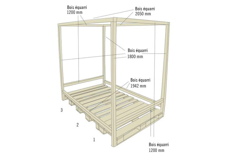 À présent, placer les deux bois équarris aux extrémités du lit de manière à ce que les équerres reposent sur la palette.