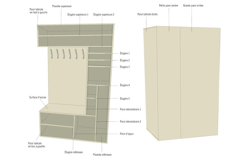 Visser la plaque de fond avec la paroi latérale en bas à gauche, la paroi d'appui et la paroi intermédiaire 2. Visser la tablette inférieure entre la paroi latérale en bas à gauche et la paroi d'appui. Visser l'assise par le haut avec la paroi latérale en bas à gauche, la paroi d'appui et par la droite avec la paroi intermédiaire 2. Visser la paroi intermédiaire 1 par le bas avec l'assise. Visser l'étagère 5 entre les deux parois intermédiaires.