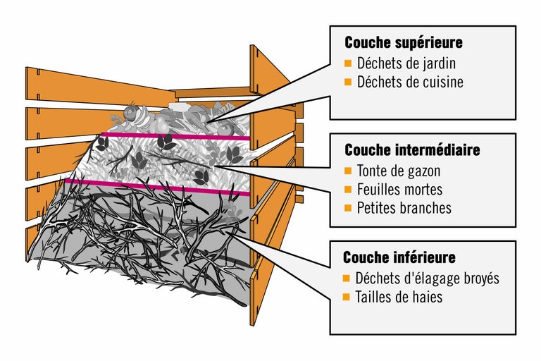 Ensuite, alterne des couches de 10 cm de hauteur maximum. Les couches alternées doivent être composées de matériaux humides, secs, fins et grossiers.