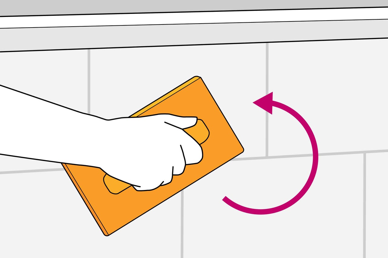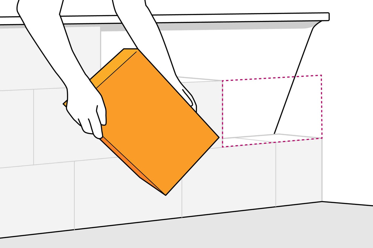 Tu peux maintenant maçonner la première rangée de ton revêtement. Pour cela, procède exactement comme pour n'importe quel autre mur. À l'aide d'une truelle, répartis le mortier sur le sol et pose la première pierre dans le coin extérieur de ta baignoire. Une fois la première rangée maçonné, tu peux poser les pierres de la rangée suivante en quinconce avec du mortier, jusqu'à ce que ton revêtement arrive au bord de la baignoire. Vérifie régulièrement à l'aide d'un niveau à bulle que le mur est bien droit.