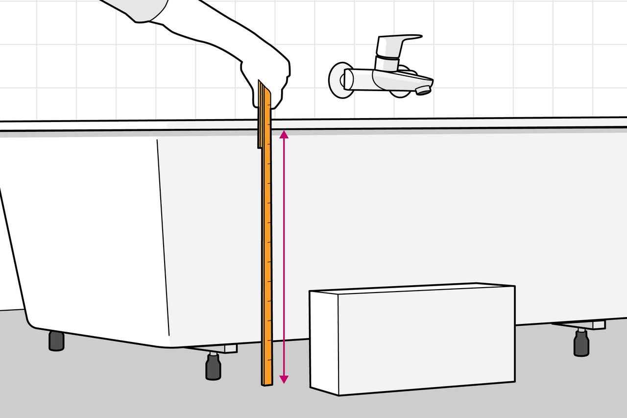 Assure-toi d'abord que ta baignoire est stable et correctement raccordée. Fais couler un peu d'eau dans la baignoire pour vérifier. Pour savoir combien de blocs il te faut pour ton habillage, tu dois tout mesurer avec précision. Pour cela, mesure la hauteur de la baignoire du sol jusqu'au rebord, ainsi que la longueur et les côtés. Les blocs doivent affleurer le rebord de la baignoire. Trace les contours de ton habillage au sol.