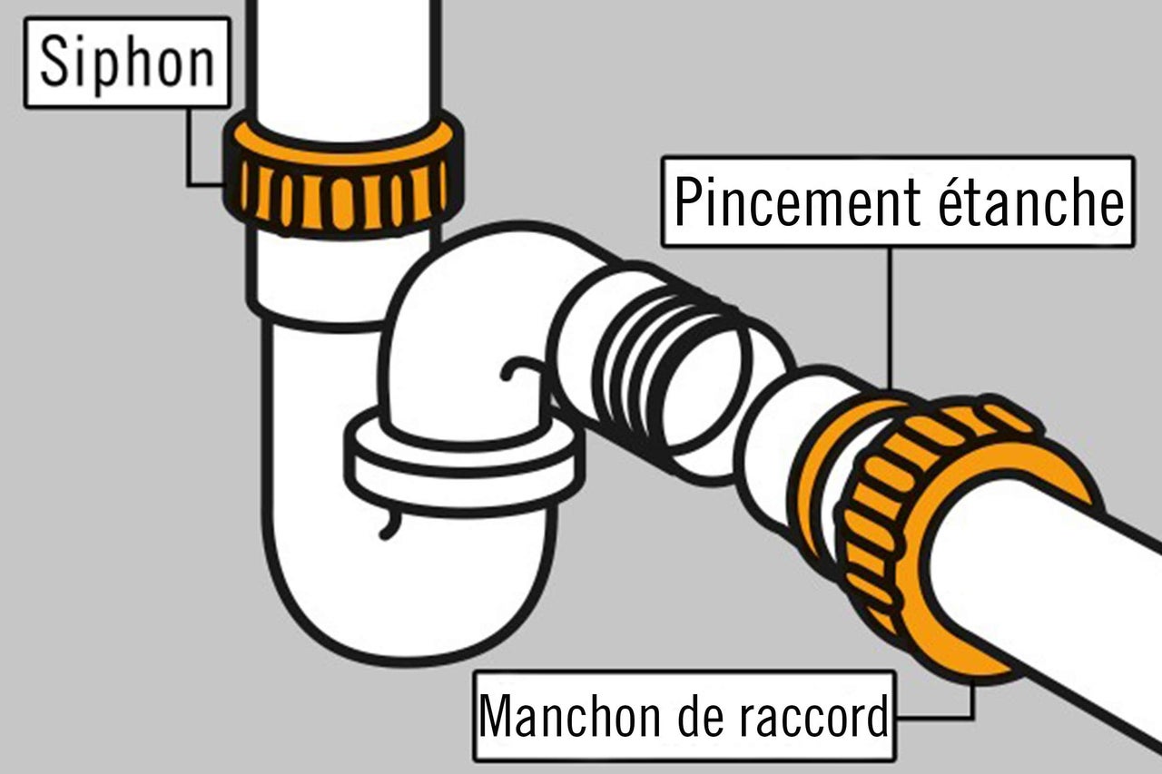 Les siphons sont montés à l'aide des pièces du système prévues à cet effet. Pour les évacuations des bacs et des baignoires, les raccords de tubes sont la plupart du temps réalisés sous forme de sertissage. Le tube est enfoncé dans le manchon, puis fixé à l'aide d'un joint d'étanchéité placé par-dessus et d'un écrou de serrage.