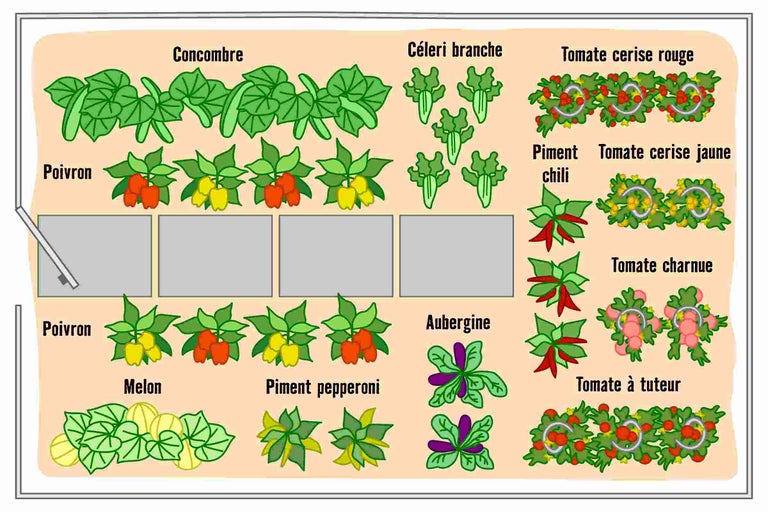 Dans la serre aussi, il est important d'avoir les bons voisins. En principe, les mêmes règles s'appliquent dans les serres qu'en pleine terre. Les tomates et les poivrons, par exemple, ne sont pas de bons voisins de plate-bande. Toutefois, il suffit souvent de planter une variété neutre entre les deux. Pour en savoir plus sur les bons et les mauvais voisins de plate-bande, consulte nos guides sur les différentes variétés de légumes.