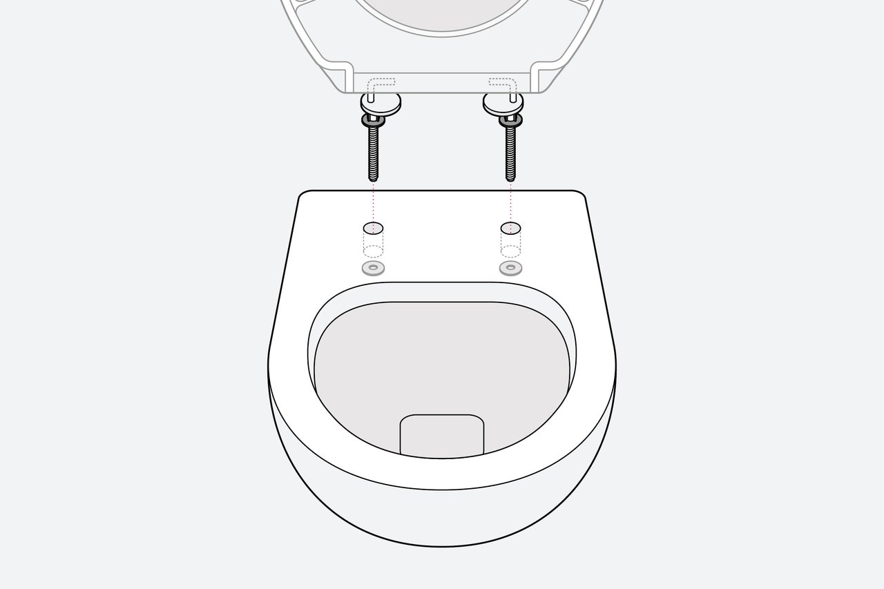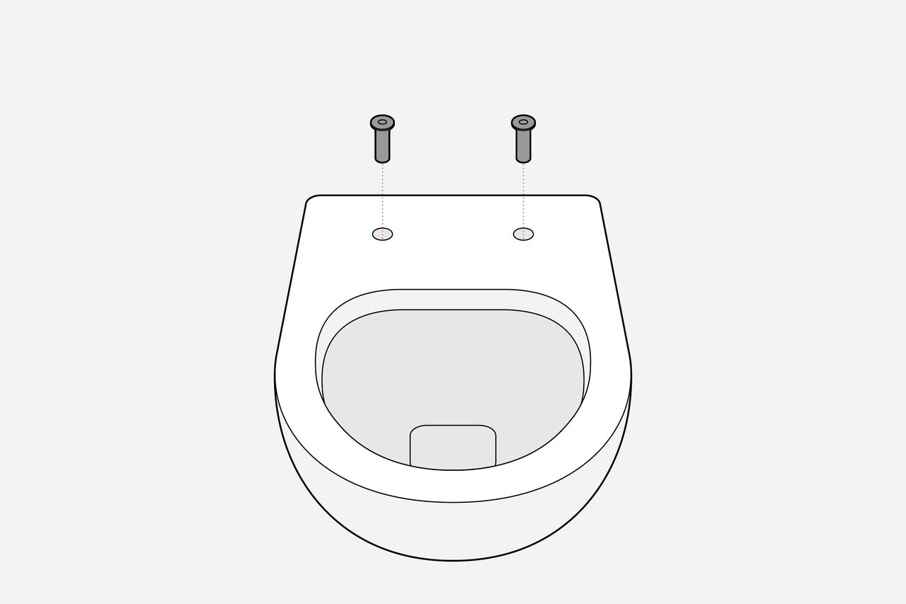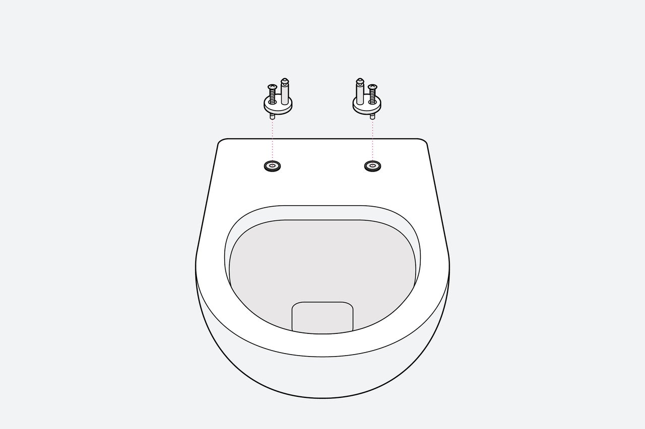 Pour installer le nouvel abattant WC, insère les tiges filetées dans les logements prévus à cet effet dans les toilettes. Tu y trouveras également les charnières. Ensuite, tu dois placer les joints d'étanchéité sur les tiges filetées par le bas.