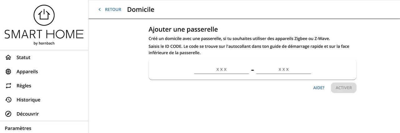 Clique sur le bouton «Connecte la passerelle avec un nouveau domicile». Dans la fenêtre suivante, entre le code ID de ta passerelle et clique sur «Activer».