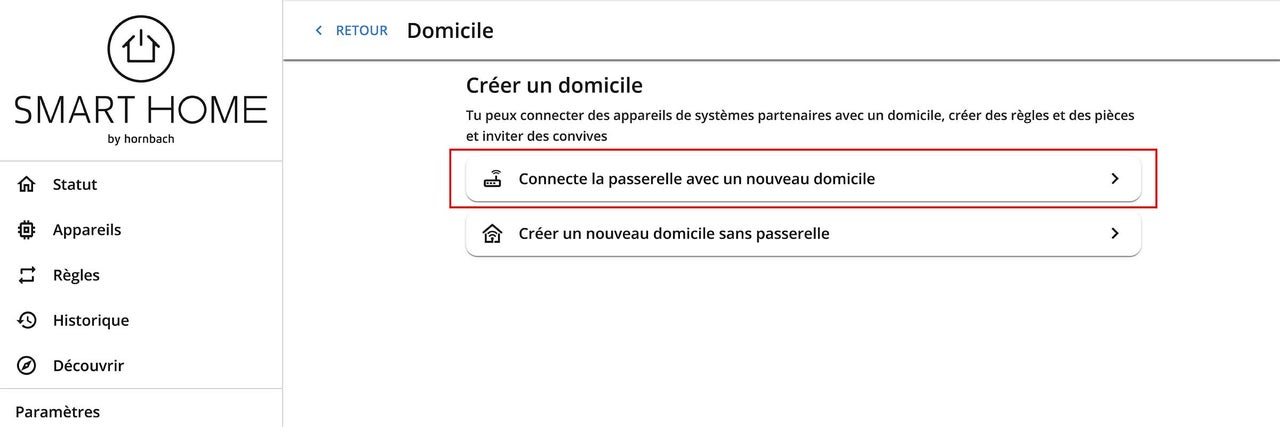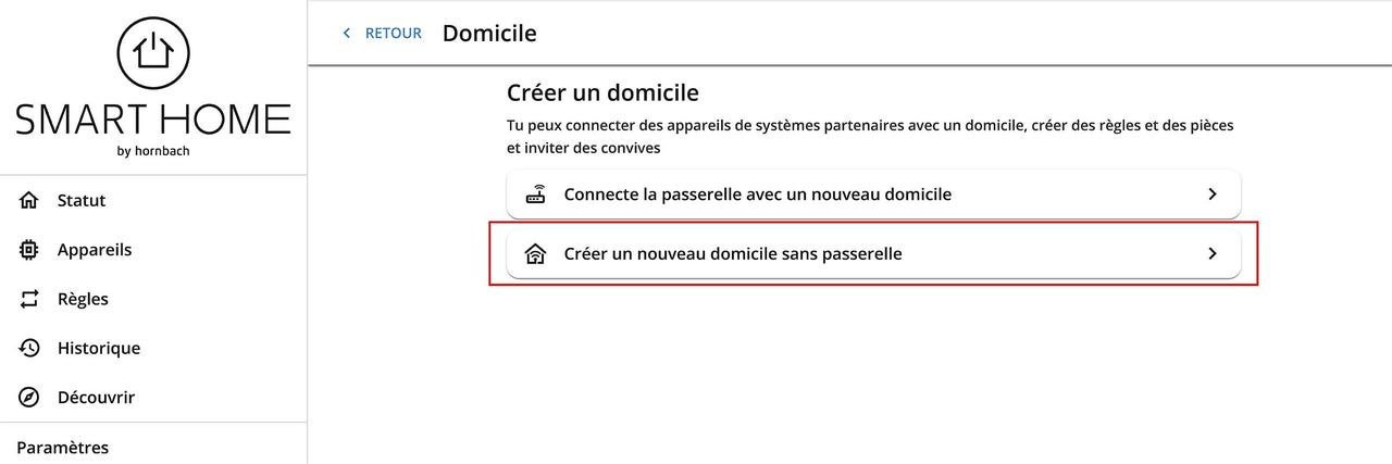 Clique sur le bouton «Créer un nouveau domicile sans passerelle», donne un nom à ton domicile à l'étape suivante et commence à configurer ta maison intelligente.